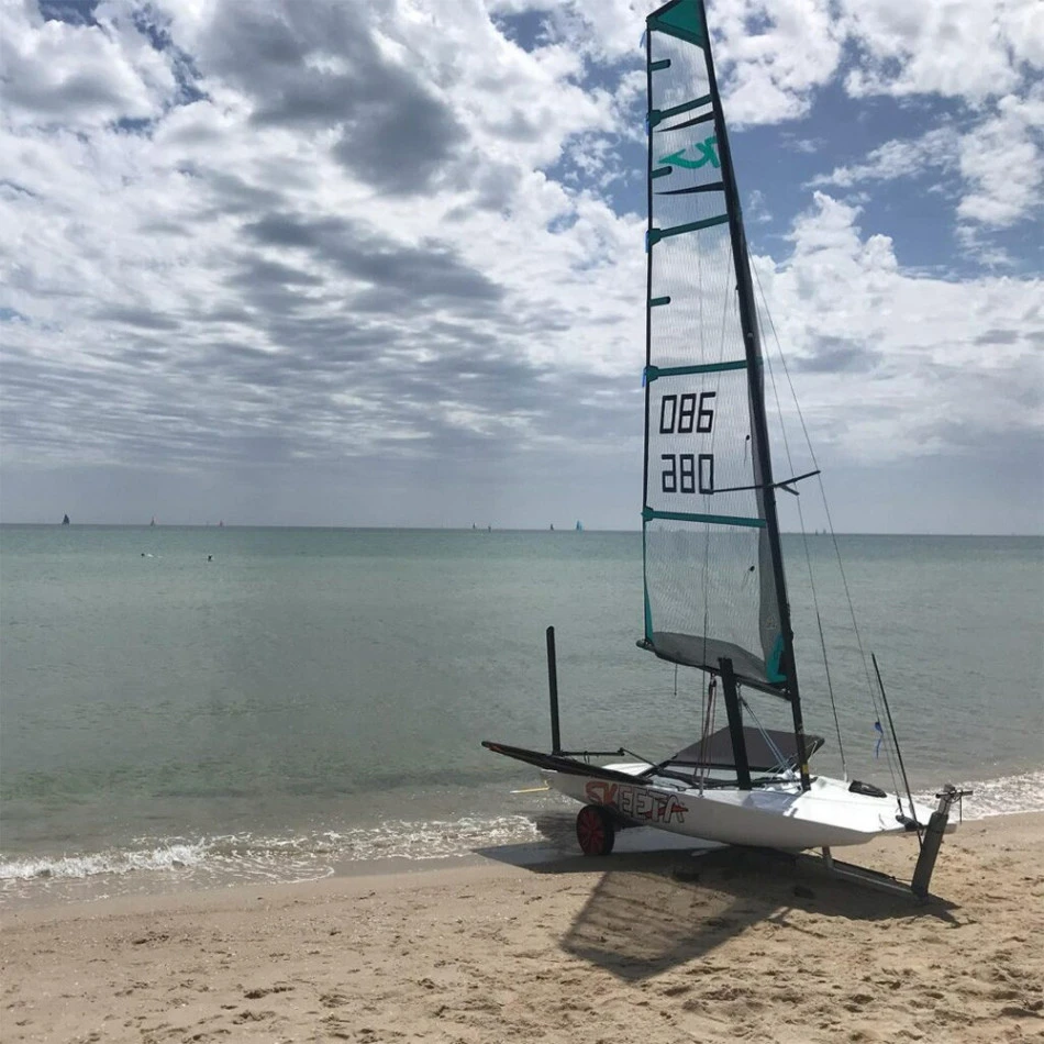Une fois en vol, le Skeeta se comporte comme les foilers les plus performants. Sa forme de carène inspirée des Scows, courte et large, sera très appréciable lors des passages délicats comme les virements et empannages plus ou moins bien maitrisés.